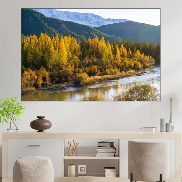 Декорация за стена (картина, пано) с мотив "Река в Алтайските планини - картина пано за стена". Изработена от олекотено PVC с дебелина 5 мм или канава от 100% памук, опъната върху дървена подрамка с дебелина 5 см. Изображението се печата с висококачествен UV печат, което е гаранция за запазване на цветовете с години!