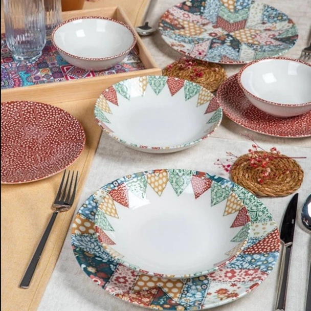 Добавете настроение и уникален почерк към всяко хранене с този порцеланов сервиз за хранене от 24 части FARIKA. Произведен в Турция и изработен от висококачествен кютайски порцелан, сервизът впечатлява със своите нежни шарки от сърца, цветя, точки и геометрични фигури. Подходящ е както за ежедневна употреба, така и за специални поводи, когато искате да впечатлите гостите си със стил и внимание към детайла.