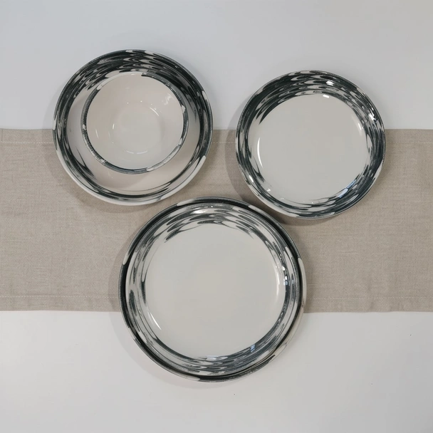 Порцелановият сервиз за хранене Водовъртеж от 24 части на турския производител TOPRAKSAN впечатлява с модерен минимализъм и артистичен характер. Комбинацията от чисто бяла основа и динамичен абстрактен мотив в графитено сиво създава усещане за движение, енергия и стил. Сервиз, който превръща всяка трапеза в дизайнерско изживяване.