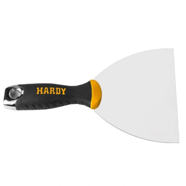 За да се осигури оптимално удобство по време на продължителни работни сесии, шпатулата е оборудвана с иновативната двукомпонентна дръжка Hardyflex. Тя е проектирана да приляга естествено в дланта, като мекият външен слой предотвратява приплъзването дори при работа с мокри ръце или предпазни ръкавици. Ергономичната форма намалява напрежението в китката, което позволява по-голям контрол и прецизност при деликатните заглаждащи движения. Стабилната връзка между острието и дръжката осигурява сигурност при по-агресивни дейности като оголване на повърхности или премахване на упорити остатъци от мазилка.