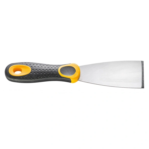 За да се осигури максимален контрол при прилагане на натиск, инструментът е оборудван с двукомпонентна дръжка. Комбинацията от твърда пластмасова основа и меки гумирани вложки гарантира стабилен захват и предотвратява приплъзването на дланта, което е от решаващо значение за безопасността при стъргане на тежки наслоявания. Ергономичната форма е проектирана да разпределя напрежението равномерно, като по този начин предпазва ръката от мазоли и умора при продължителна употреба. Моделът е еднакво ефективен както при професионални строителни обекти, така и при домашни ремонтни проекти, изискващи надеждна и здрава екипировка.
