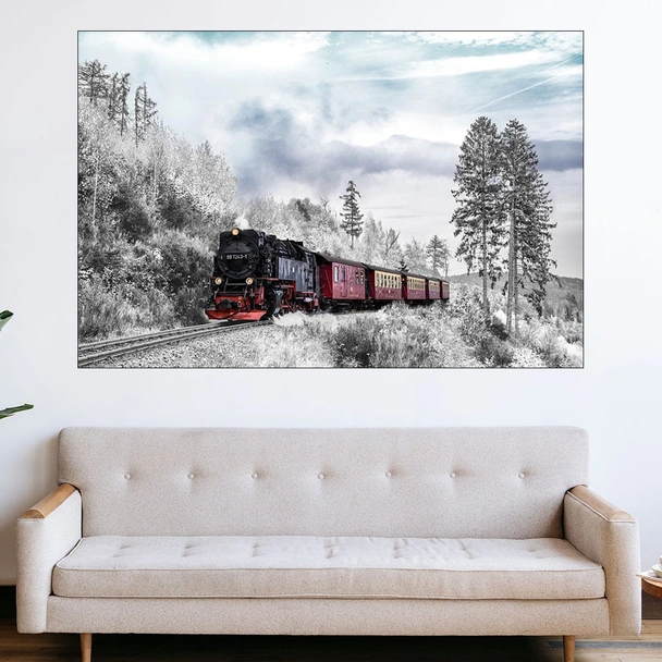 Декорация за стена (картина, пано) с мотив "Пътнически влак през зимата - картина пано за стена". Изработена от олекотено PVC с дебелина 5 мм или канава от 100% памук, опъната върху дървена подрамка с дебелина 5 см. Изображението се печата с висококачествен UV печат, което е гаранция за запазване на цветовете с години!