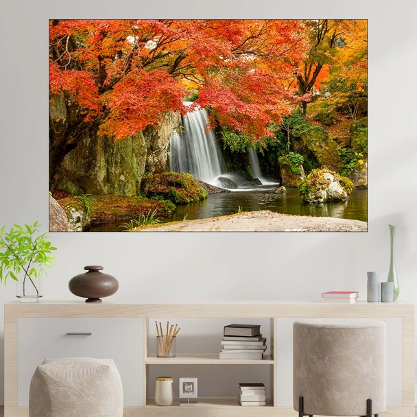 Декорация за стена (картина, пано) с мотив "Горски водопад през есента - картина пано за стена". Изработена от олекотено PVC с дебелина 5 мм или канава от 100% памук, опъната върху дървена подрамка с дебелина 5 см. Изображението се печата с висококачествен UV печат, което е гаранция за запазване на цветовете с години!