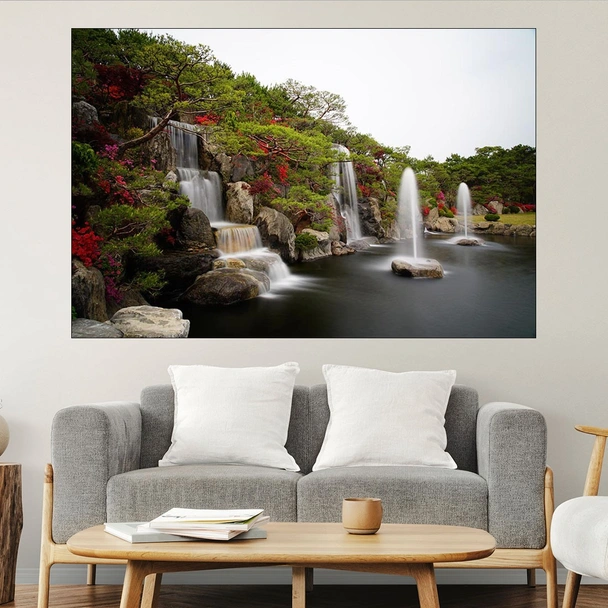Декорация за стена (картина, пано) с мотив "Водопад и цветя - картина пано за стена". Изработена от олекотено PVC с дебелина 5 мм или канава от 100% памук, опъната върху дървена подрамка с дебелина 5 см. Изображението се печата с висококачествен UV печат, което е гаранция за запазване на цветовете с години!
