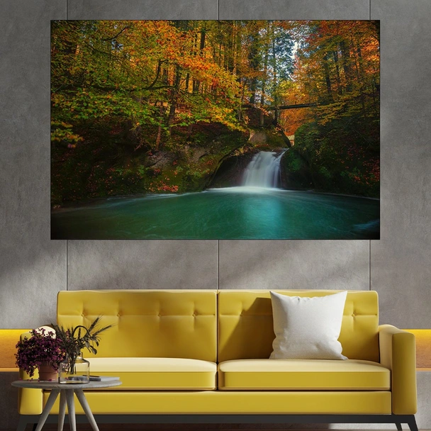 Декорация за стена (картина, пано) с мотив "Водопад и есен в гората - картина пано за стена". Изработена от олекотено PVC с дебелина 5 мм или канава от 100% памук, опъната върху дървена подрамка с дебелина 5 см. Изображението се печата с висококачествен UV печат, което е гаранция за запазване на цветовете с години!