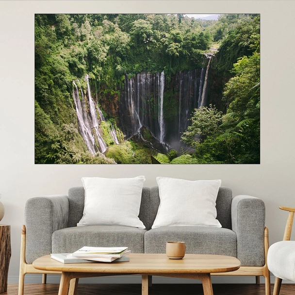Декорация за стена (картина, пано) с мотив "Водопада tumpaksewu в Индонезия - картина пано за стена". Изработена от олекотено PVC с дебелина 5 мм или канава от 100% памук, опъната върху дървена подрамка с дебелина 5 см. Изображението се печата с висококачествен UV печат, което е гаранция за запазване на цветовете с години!