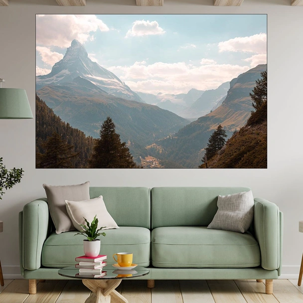 Декорация за стена (картина, пано) с мотив "Изглед към връх Матерхорн - картина пано за стена". Изработена от олекотено PVC с дебелина 5 мм или канава от 100% памук, опъната върху дървена подрамка с дебелина 5 см. Изображението се печата с висококачествен UV печат, което е гаранция за запазване на цветовете с години!