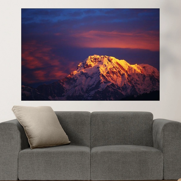 Декорация за стена (картина, пано) с мотив "Залез над връх Анапурна - картина пано за стена". Изработена от олекотено PVC с дебелина 5 мм или канава от 100% памук, опъната върху дървена подрамка с дебелина 5 см. Изображението се печата с висококачествен UV печат, което е гаранция за запазване на цветовете с години!