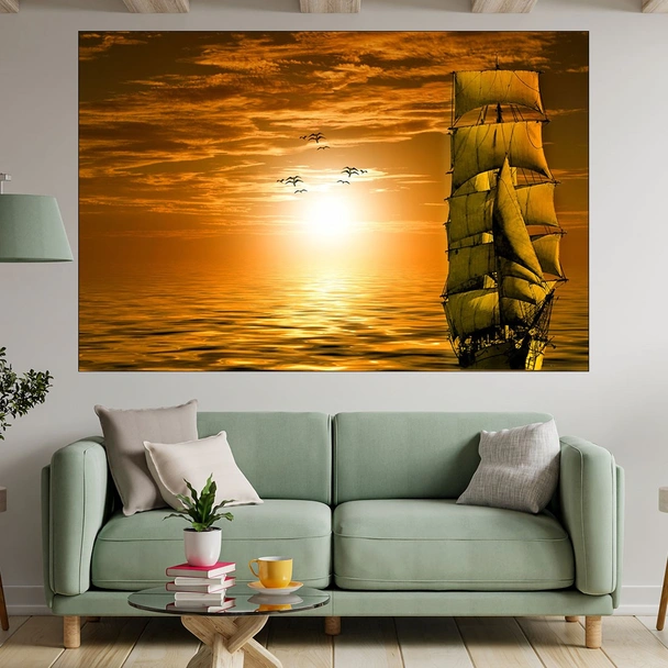 Декорация за стена (картина, пано) с мотив "Кораб и залез в океана - картина пано за стена". Изработена от олекотено PVC с дебелина 5 мм или канава от 100% памук, опъната върху дървена подрамка с дебелина 5 см. Изображението се печата с висококачествен UV печат, което е гаранция за запазване на цветовете с години!