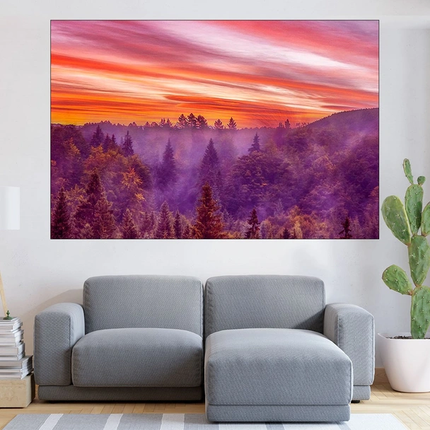Декорация за стена (картина, пано) с мотив "Уникален залез над гората - картина пано за стена". Изработена от олекотено PVC с дебелина 5 мм или канава от 100% памук, опъната върху дървена подрамка с дебелина 5 см. Изображението се печата с висококачествен UV печат, което е гаранция за запазване на цветовете с години!