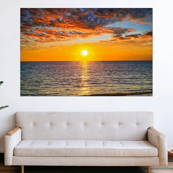 Декорация за стена (картина, пано) с мотив "Залез и красиво небе в океана - картина пано за стена". Изработена от олекотено PVC с дебелина 5 мм или канава от 100% памук, опъната върху дървена подрамка с дебелина 5 см. Изображението се печата с висококачествен UV печат, което е гаранция за запазване на цветовете с години!