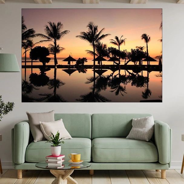 Декорация за стена (картина, пано) с мотив "Залез над Бали - картина пано за стена". Изработена от олекотено PVC с дебелина 5 мм или канава от 100% памук, опъната върху дървена подрамка с дебелина 5 см. Изображението се печата с висококачествен UV печат, което е гаранция за запазване на цветовете с години!