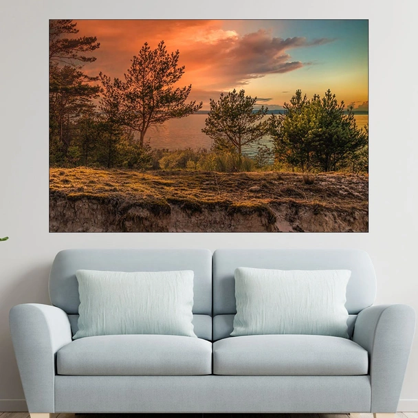 Декорация за стена (картина, пано) с мотив "Залез над голямо езеро - картина пано за стена". Изработена от олекотено PVC с дебелина 5 мм или канава от 100% памук, опъната върху дървена подрамка с дебелина 5 см. Изображението се печата с висококачествен UV печат, което е гаранция за запазване на цветовете с години!