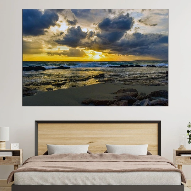 Декорация за стена (картина, пано) с мотив "Залез над морско крайбрежие - картина пано за стена". Изработена от олекотено PVC с дебелина 5 мм или канава от 100% памук, опъната върху дървена подрамка с дебелина 5 см. Изображението се печата с висококачествен UV печат, което е гаранция за запазване на цветовете с години!