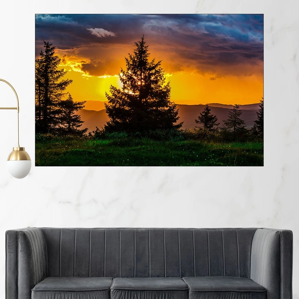 Декорация за стена (картина, пано) с мотив "Залез над планината - картина пано за стена". Изработена от олекотено PVC с дебелина 5 мм или канава от 100% памук, опъната върху дървена подрамка с дебелина 5 см. Изображението се печата с висококачествен UV печат, което е гаранция за запазване на цветовете с години!