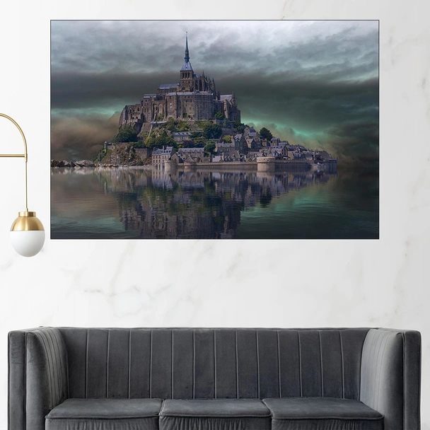 Декорация за стена (картина, пано) с мотив "Замък върху малък остров - картина пано за стена". Изработена от олекотено PVC с дебелина 5 мм или канава от 100% памук, опъната върху дървена подрамка с дебелина 5 см. Изображението се печата с висококачествен UV печат, което е гаранция за запазване на цветовете с години!